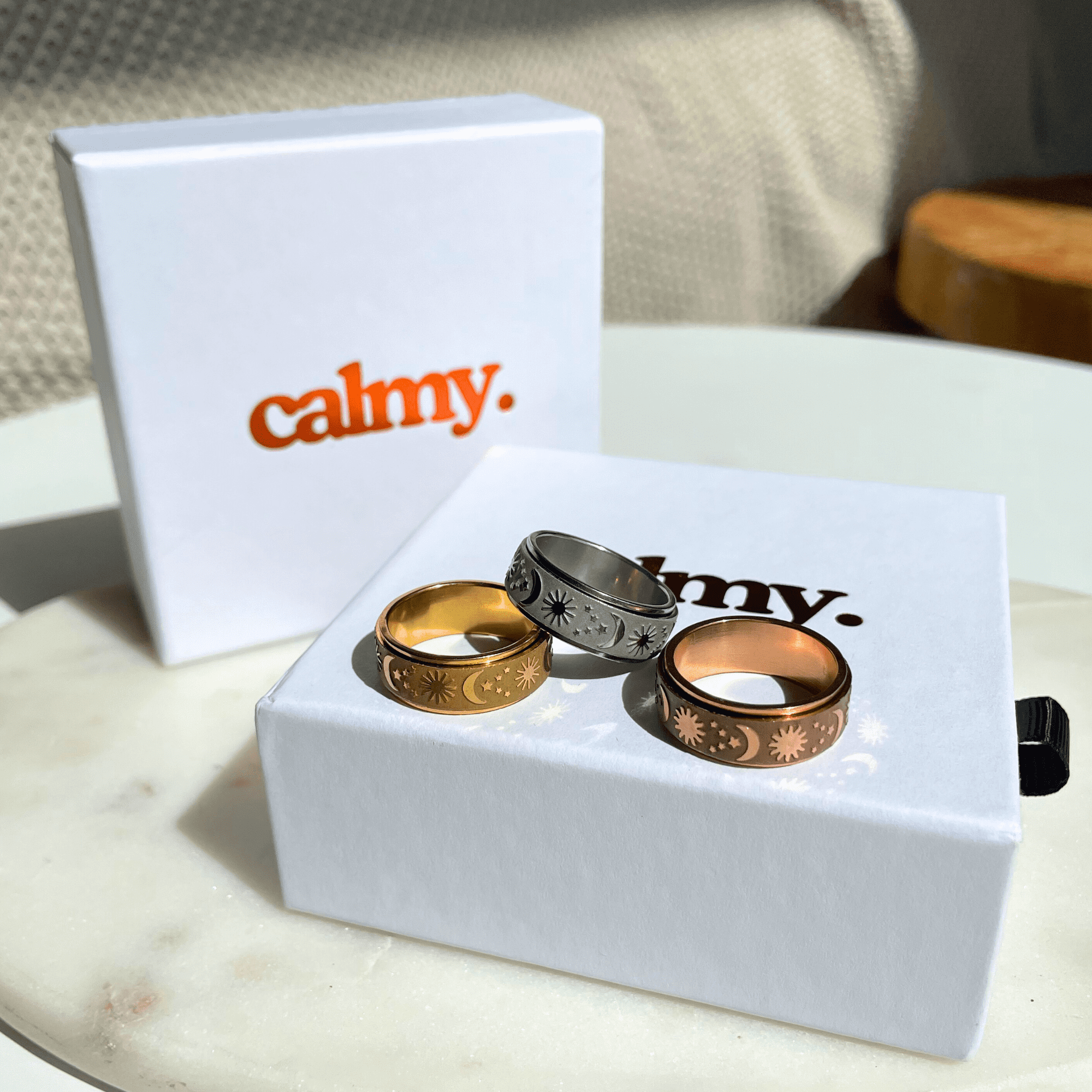 Les anneaux sensoriels Calmy intègrent un mécanisme de rotation à 360° autour du doigt, offrant un soulagement instantané en transformant le stress et l'anxiété en un geste apaisant et discret.